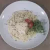 mit Hühnchen streifen, Pilzen, Erbsen, Sahnesauce